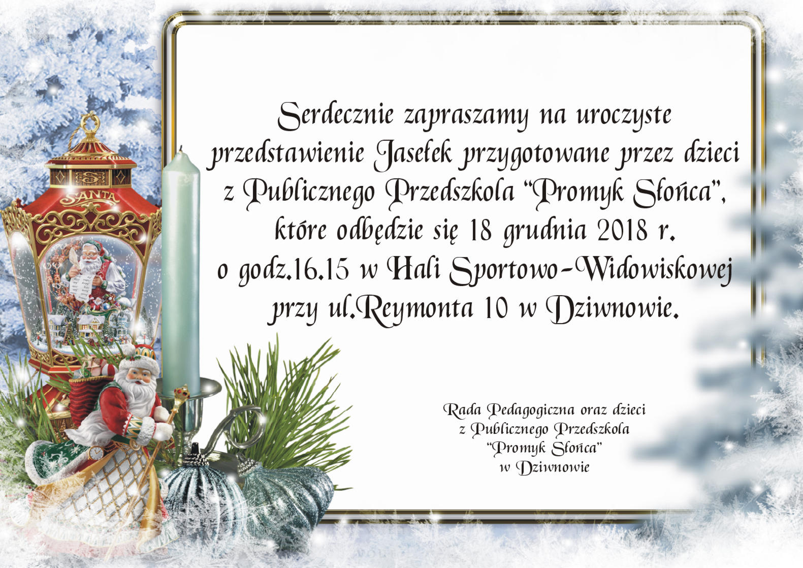 Serdecznie zapraszamy na uroczyste przedstawienie Jasełek przygotowane przez dzieci z Publicznego Przedszkola “Promyk Słońca”, które odbędzie się 18 grudnia 2018 r.